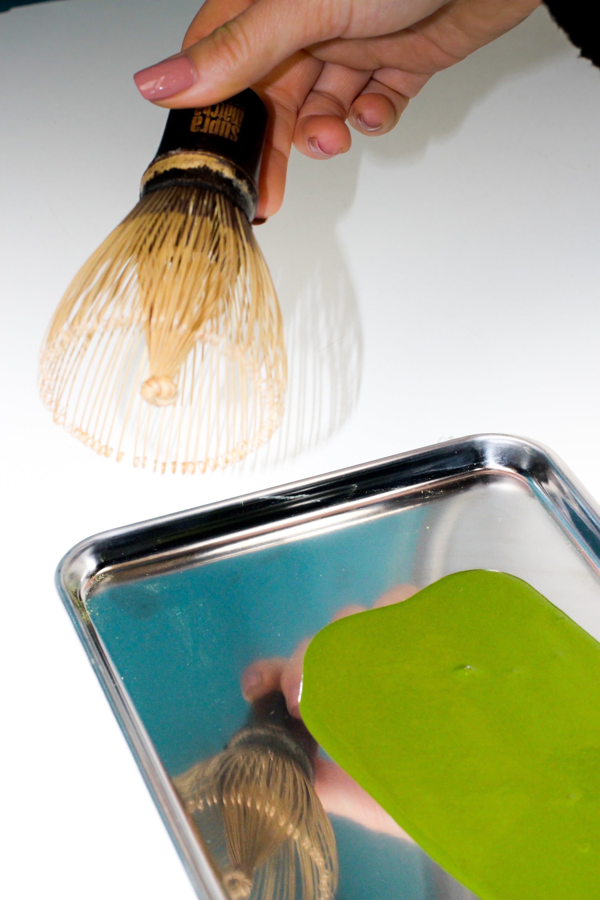Fouetter énergiquement au fouet bambou Chasen avec des mouvements en M ou W jusqu’à obtenir une mousse fine.